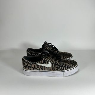 Scarpe Nike Air con un accattivante design zebrato. - Fantasia zebrata marrone e nera. - Logo Swoosh Nike bianco.