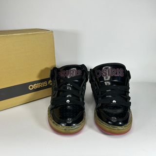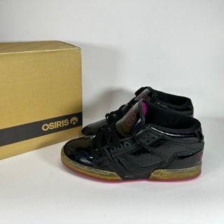 Scarpe da uomo Osiris in vernice nera con dettagli rosa. Nuove, mai usate. - Disponibili nelle taglie 35, 38, 39.5 e 40. - Design mid-top.