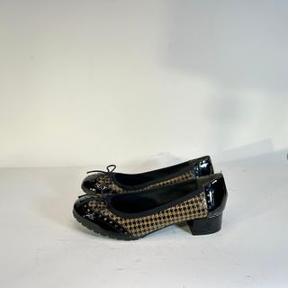Eleganti ballerine da donna, perfette per completare ogni outfit. - Fantasia pied-de-poule marrone e nero. - Dettagli in vernice lucida. - Piccolo fiocco decorativo sulla punta. - Tacco basso e comodo.