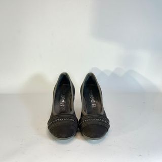 Eleganti scarpe con tacco del marchio Miss Clair. - Materiale scamosciato. - Dettaglio con borchie e cuciture decorative sulla punta. - Tacco robusto e plateau anteriore. Taglie disponibili 37.5/40