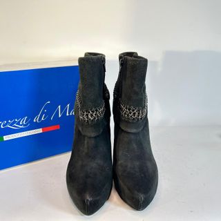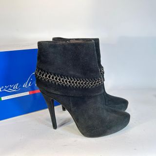 Eleganti stivaletti in camoscio nero con dettaglio a catena. - Materiale: camoscio - Dettaglio: catena decorativa - Altezza tacco: 10 cm circa - Plateau anteriore: 2 cm circa