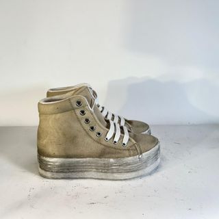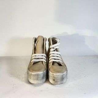 Scarpe alte JC PLAY in tela color beige con plateau. - Lacci bianchi. - Suola platform spessa.