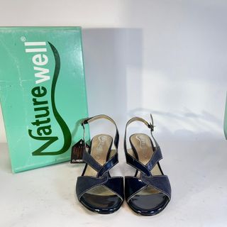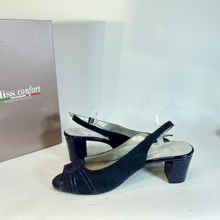 Eleganti scarpe slingback Miss Confort. - Materiale scamosciato blu con inserti lucidi. - Tacco largo e comodo. - Cinturino regolabile alla caviglia.