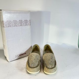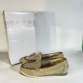 Eleganti mocassini da donna con dettagli scintillanti. - Tomaia in morbida pelle scamosciata. - Decorazione frontale con strass. - Suola flessibile per un comfort duraturo.