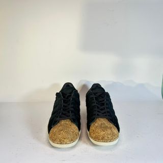 Scarpe Adidas Superstar in camoscio nero con dettagli in sughero. - Tomaia in morbido camoscio. - Iconico guscio a conchiglia in sughero. - Suola in gomma resistente.