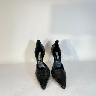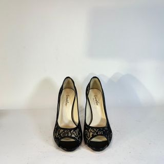 Eleganti scarpe décolleté con tacco alto, perfette per un'occasione speciale. - Tomaia in pizzo nero. - Dettagli in vernice. - Punta aperta.