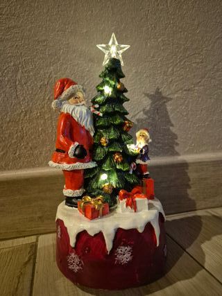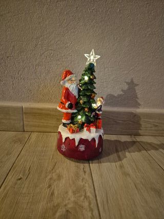 Carillon natalizio con una scena di Babbo Natale e un albero decorato. La base è rossa con decorazioni bianche. - Figura di Babbo Natale. - Albero di Natale illuminato. - Base decorata con fiocchi di neve.