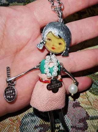 Collana con ciondolo a forma di bambola stilizzata, che tiene in mano una racchetta. - Vestitino in stoffa. - Dettagli in perline. - Ciondolo a forma di racchetta. - Elementi metallici color argento. - Usata pochissime volte. - Perfette condizioni come da foto. - La scatola non è originale. Vendo per inutilizzo. Spedisco subito.