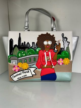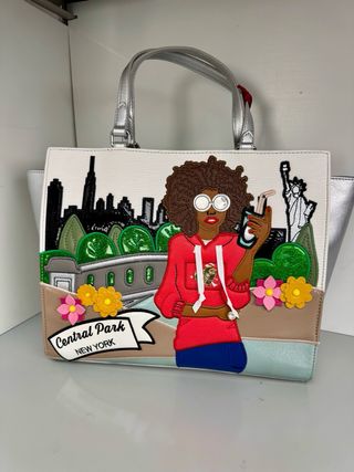 Borsa da donna con un vivace design ispirato a Central Park, New York. Presenta dettagli ricamati e applicazioni che raffigurano la skyline della città, la Statua della Libertà e una figura femminile. - Design unico con tema Central Park, New York. - Applicazioni ricamate e dettagli colorati. - Manici argentati.