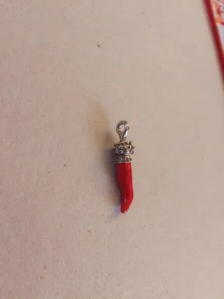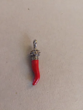 Ciondolo a forma di cornetto portafortuna. - Materiale: plastica. - Dettagli in argento.