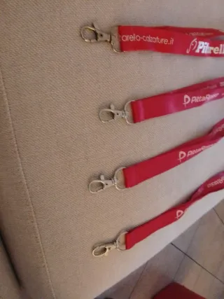 Set di quattro portachiavi da collo. - Colore rosso vivace. - Logo PittaRosso stampato. - Clip metallica per aggancio.