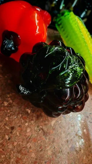 Bellissimi oggetti in vetro di Murano a forma di frutta. Lunghezza 17,15,13 cm. Il mais ha una figlia rotta visibile ultima foto - Peperone rosso - Pannocchia di mais - Grappolo d'uva scuro