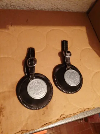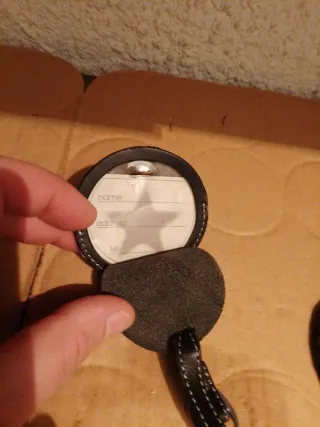Set di due porta indirizzo per valigie. - Design rotondo in pelle. - Dettaglio metallico con logo. - Chiusura con cinturino e fibbia.