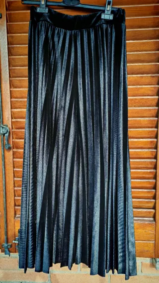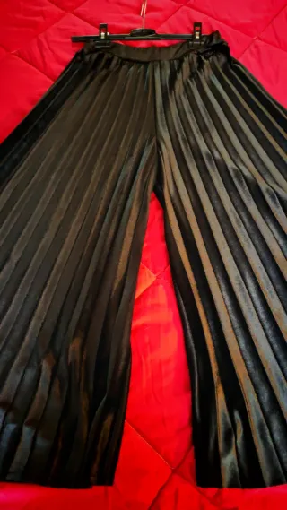 Pantaloni ampi con un design plissettato e un tessuto in velluto lucido. Made Italia - Vita elasticizzata con dettagli glitterati. - Gamba larga e fluida.