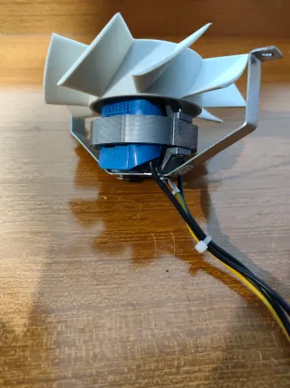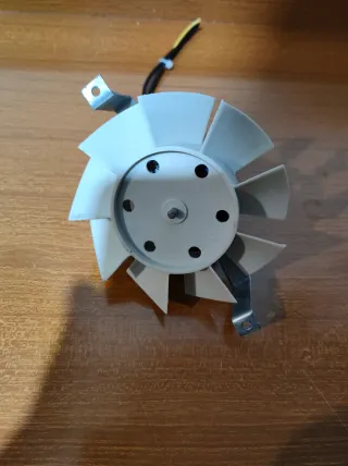 Ricambio motore per ventola di raffreddamento di gelatiera DeLonghi. Ick 5000 - Ventola con pale in plastica bianca. - Motore con avvolgimento metallico e parte blu. - Staffa di montaggio in metallo. - Cavi di collegamento neri e gialli.