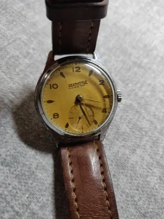 Eberhard & Co. Orologio da polso da uomo con cinturino in pelle marrone e quadrante dorato. Eberhard Chaux-De-Fonds. Perfettamente funzionante e mantiene tempo. - Cassa in metallo. - Cinturino in pelle marrone con cuciture a vista. - Quadrante di colore dorato con indici applicati e piccoli secondi.