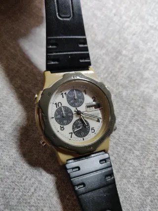 Orologio Casio modello 1325 MW con cinturino nero e cassa beige. Funzionante. - Quadrante bianco con indici neri. - Cronografo con tre sotto-quadranti. - Lunetta esterna con indicazioni. - Cinturino in gomma nero.