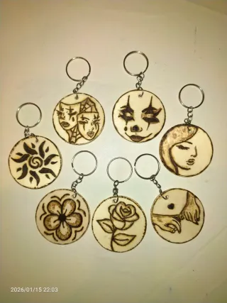 Set di portachiavi unici, realizzati e decorati a mano con la tecnica della pirografia. - Design con maschere teatrali. - Volto da clown. - Profilo di donna. - Motivo floreale. - Rosa. - Mani che si stringono. - Sole stilizzato. -Disponibili anche con segni zodiacali