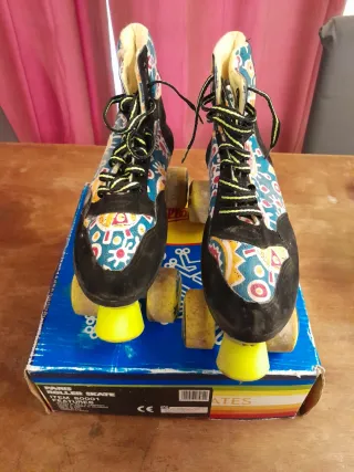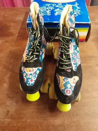 Pattini roller vintage Paris con un design colorato e vivace. - Tomaie stampate con motivi geometrici e floreali. - Lacci bicolore giallo fluo e neri. - Ruote gialle. - Scatola originale inclusa.