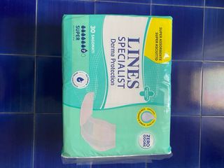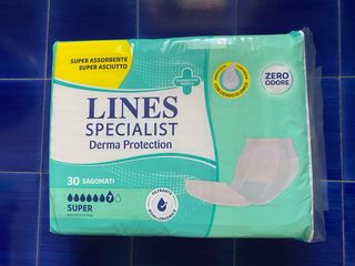 Confezione di Lines Specialist Classic Sagomato Super. Disponibili 2 confezioni Super e 5 Extra con prezzo da concordare. -Barriere protettive laterali: aiutano a prevenire le fuoriuscite di liquidi e solidi. -Nucleo Controlla Odori. -Lozione lenitiva con Aloe: offre una azione lenitiva e protettiva. La lozione arricchita con Aloe, emolliente naturale, allontana lumidità dalla pelle aiutando a prevenire le irritazioni. Tale lozione è applicata sulla parte posteriore del prodotto che, in uso, è a contatto con la zona sacro-coccigea, particolarmente soggetta alla formazione di piaghe da decubito. -Indicatori di cambio: diventa azzurro