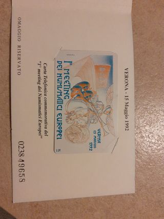Busta omaggio 1° Meeting Numismatici Europei tenutosi a Verona nel 1992 con inserita scheda telefonica commemorativa - Illustrazione a tema con carrozza e figure. - Data: 15 Maggio 1992. - Luogo: Verona.