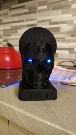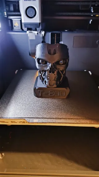 Supporto stampato in 3D rappresentante il busto del T-800 di Terminator. Realizzato in PLA nero. - Design dettagliato. - Base stabile con scritta T-800.