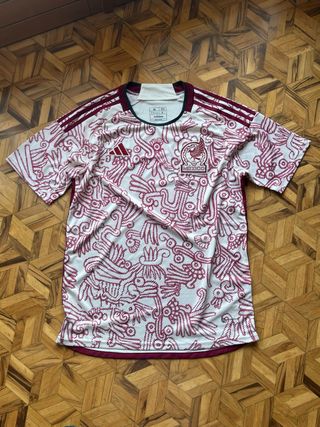 Maglia da calcio Adidas Messico, modello Away 2022. - Design con pattern ispirato alla cultura messicana. - Colore bianco con dettagli bordeaux. - Logo Adidas e stemma Messico sul petto.