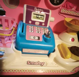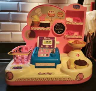 Diamo spazio alla fantasia dei nostri bimbi con questo negozio di pasticceria a tema Peppa Pig del marchio Smoby. Si possono scegliere i pasticcini dagli scaffali, metterli nel cestino, pesarli sulla bilancia e infine pagarli alla cassa con monete o carta di credito. 40*37h*22 Condizioni ottime.