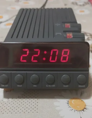 Radiosveglia vintage dal design retrò. Un pezzo unico per la tua camera da letto. Leggermente segno sul vetro del display. Si nota nell'ultima foto - Display digitale a LED rossi. - Controlli a manopola. - Finitura grigio scuro.