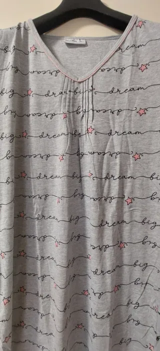 Camicia da notte comoda e leggera, perfetta per il riposo. - Fantasia con scritte dream big e stelline. - Scollo a V con pieghe decorative. - Tessuto morbido e traspirante. Mai indossata. Solo lavatae Tagliata l'etichetta.