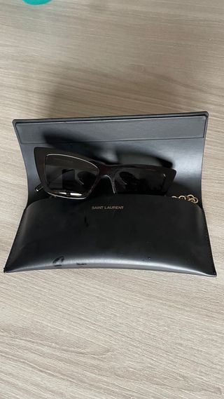 Eleganti occhiali da sole Yves Saint Laurent con montatura tartarugata e lenti scure. Inclusa catenina dorata. - Montatura a farfalla. - Lenti con protezione UV. - Catenina in metallo dorato.