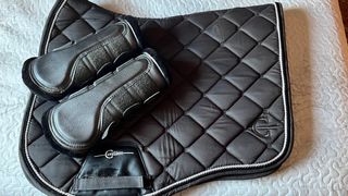 Set di protezioni per cavalli in taglia FULL. Include protezioni per tendini e stinchi, oltre a una coperta. Protezioni per tendini e stinchi imbottiti. Coperta imbottita con design a rombi. Chiusura con velcro sui protettori. Bordatura in bianco e nero sulla coperta.