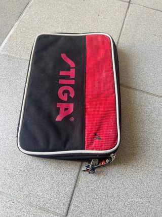 Fodero per racchetta da ping pong della marca STIGA. Design bicolore in nero e rosso. Con due scomparti, esternamente è in ottime condizioni, internamente si trova bene, solo un po' di usura. Chiusura con cerniera. Include tiratore per la cerniera.