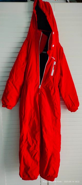 Tuta da sci intera di colore rosso. - Cappuccio con fodera interna nera. - Zip frontale completa. - Tasca con zip sul petto.