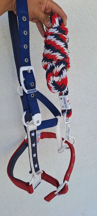 Vendo bellissima cavezza Pool's America a tema USA, con corda intrecciata. - La cavezza è blu, bianca e rossa. - La corda è abbinata, nei colori blu, bianco e rosso. - Perfetta per il tuo cavallo! - Ottime condizioni.