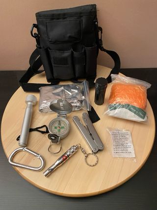 Kit di sopravvivenza compatto e leggero, ideale per escursioni. - Zainetto portaoggetti con scomparti. - Bussola. - Torcia (batterie non incluse). - Multitool. - Fischietto. - Colettino multiuso. - Telo termico. - Poncho impermeabile. - Ganci metallici.