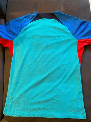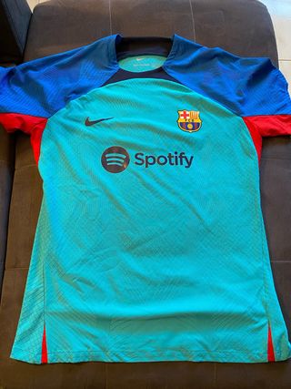 Vendo maglia da allenamento del FC Barcelona, modello femminile. È in ottime condizioni ed è di colore turchese con dettagli blu e rossi. - Maglia ufficiale del FC Barcelona. - Modello femminile taglia L - Colore turchese con dettagli blu e rossi. - Sponsor Spotify.