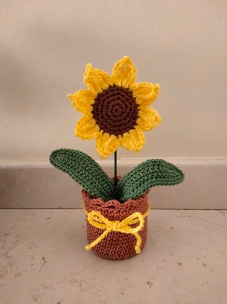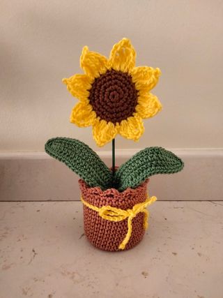 Deliziosa piantina di girasole realizzata interamente all'uncinetto, perfetta per aggiungere un tocco di colore e allegria. - Fiore di girasole giallo con centro marrone. - Due foglie verdi. - Vaso marrone decorato con un fiocco giallo.