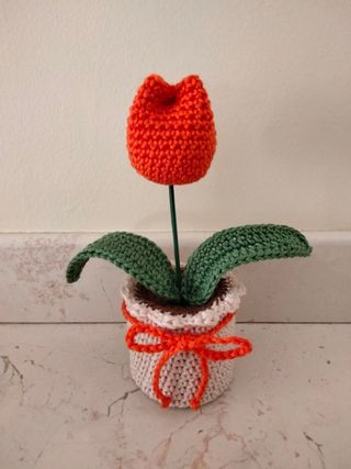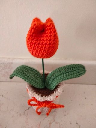 Deliziosa piantina di tulipano realizzata all'uncinetto, perfetta per aggiungere un tocco di colore e artigianalità alla tua casa. - Fiore di tulipano arancione. - Foglie verdi. - Vaso decorato con fiocco arancione.