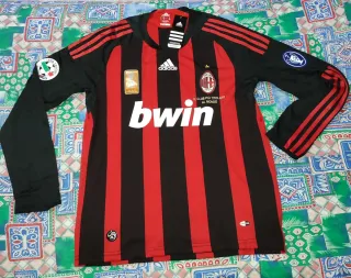 Maglia da calcio AC Milan a maniche lunghe, modello retro. - Colore nero e rosso a strisce verticali. - Sponsor bwin sul petto. - Logo Adidas e stemma AC Milan. - Patch Lega Calcio sul braccio sinistro. Taglia M