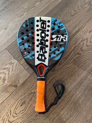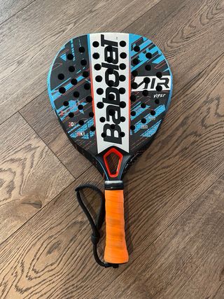 Usata con cura, imperfezioni come da foto. Racchetta da padel Babolat Air Viper, modello 2023. Design moderno con finiture in nero, blu e bianco. - Logo Babolat in rilievo. - Superficie forata. - Impugnatura arancione. - Laccetto di sicurezza nero.