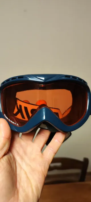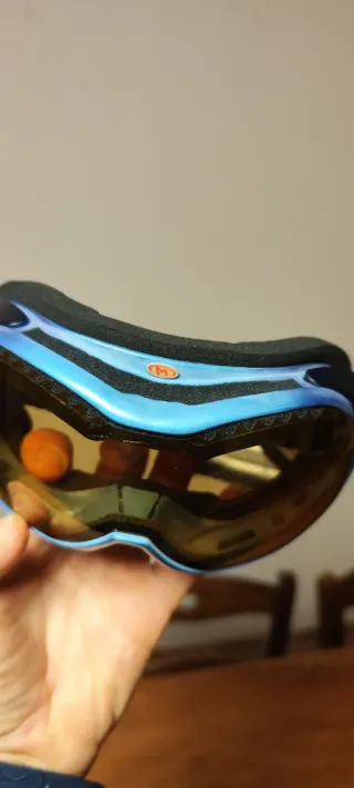 Maschera da sci o snowboard marca Briko. - Lente arancione. - Montatura blu. - Cinturino con logo. usata in settimana bianca e mai più utilizzata