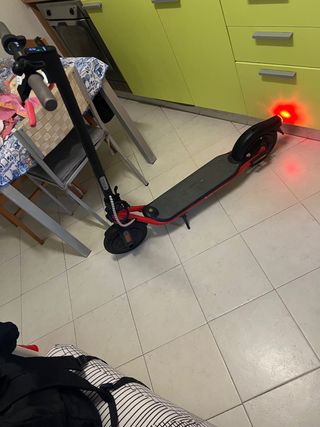 Monopattino elettrico con luci anteriori e posteriori. - Manubrio con impugnature nere e leva rossa. - Luce bianca anteriore. - Luce rossa posteriore. - Ruote nere. - Cavo di sicurezza blu e rosso.