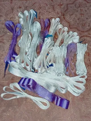 Set di cinghie di carico in tessuto. Qualcuna lunga 6 metri Diverse misure Buono stato - Cinghie bianche e viola. - Materiale resistente.