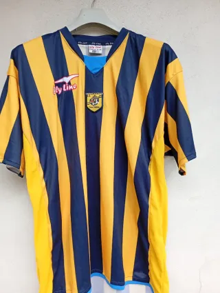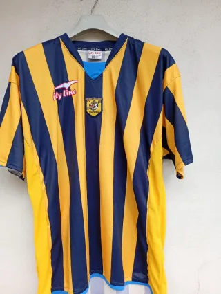 Maglia da calcio della Juve Stabia, modello Home per la stagione 2009/2010. - Design a strisce verticali blu e gialle. - Logo Fly Line sul petto. - Stemma della squadra sul petto Dietro la schiena c'è una scritta che somiglia ad un autografo ma è anonimo. Taglia XXL
