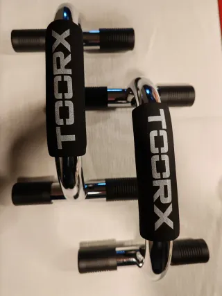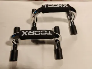 Coppia di maniglie per flessioni (o push-up bars) del marchio Toorx, utilizzate per l'allenamento della parte superiore del corpo. - Struttura in metallo cromato. - Impugnatura antiscivolo. - Logo TOORX stampato.