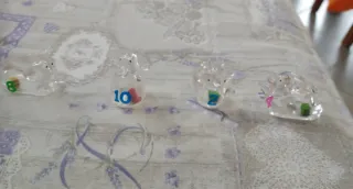 Set di 4 dadi trasparenti con numeri e inserti colorati. - Dadi con numeri da 8, 10, 2 e 9. - Inserti interni di colore rosa, verde e fucsia. - Materiale trasparente. -Vendibili anche singolarmente. -Ben tenuti e in ottime condizioni.