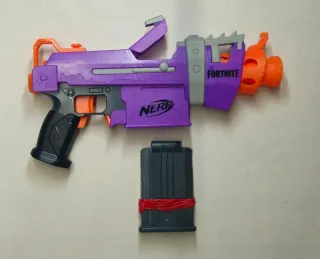 Pistola giocattolo Nerf ispirata a Fortnite. Presenta un design colorato con finiture viola, arancioni e grigie. - Logo Fortnite inciso. - Logo Nerf visibile. - Caricatore incluso.