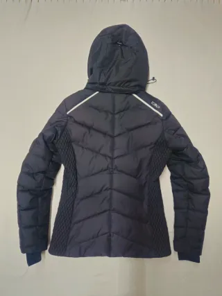 Giubbotto imbottito CMP da donna, ideale per lo sci. Taglia XS. - Colore blu scuro. - Cappuccio integrato. - Inserti trapuntati e trapuntati. - Dettagli bianchi sulle spalle. - Logo CMP sulla spalla destra.