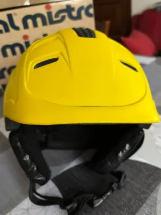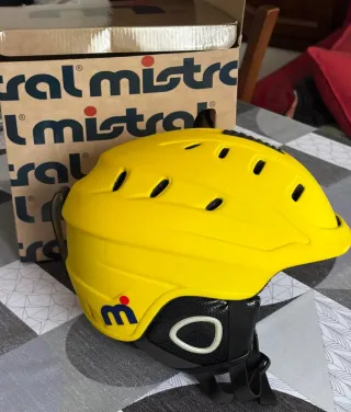 Casco da sci Mistral per adulti, colore giallo vivace. La taglia è S-M. Scatola originale e sacchetto di stoffa per protezione. - Design moderno e sicuro. - Logo Mistral sul lato.